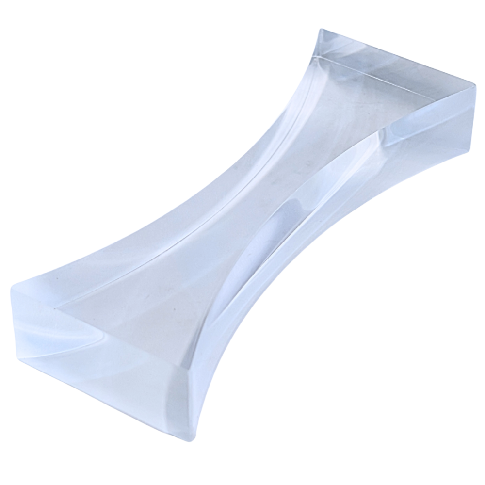 This acrylic bi-concave lens is designed for optical experiments and physics education, measuring 90 mm × 34 mm x 15 mm, with two concave curved sides and a clear surface for direct observation. Its compact geometry provides stability on flat surfaces, making it for studying refraction, beam divergence, and light path behavior in laboratory and classroom demonstrations.